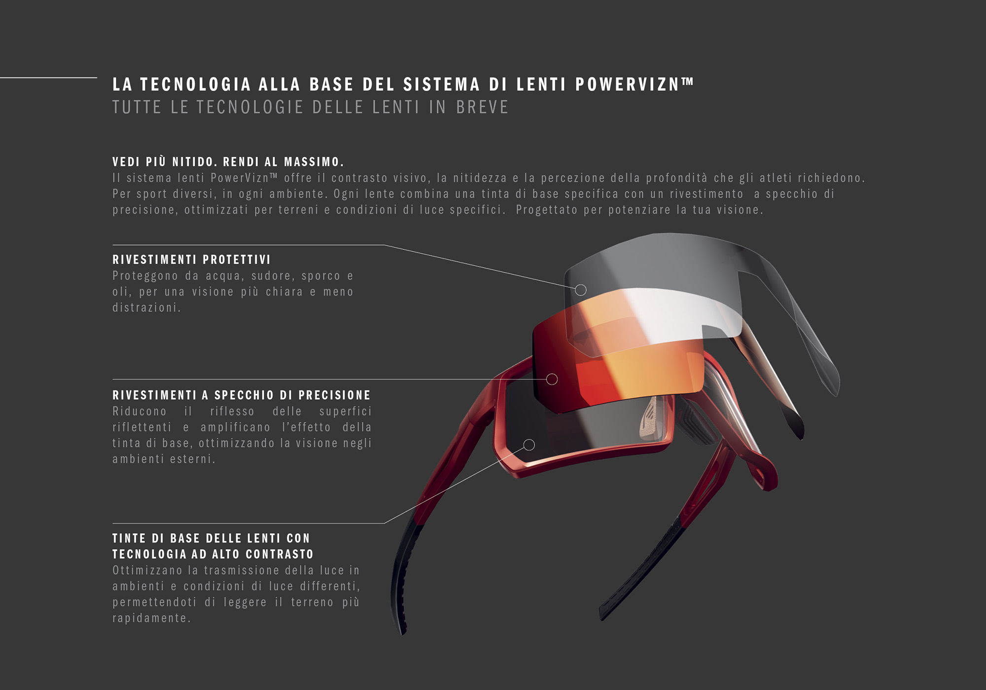 La combinazione tra tinta base calibrata, specchiatura e trattamenti protettivi avanzati consente di gestire al meglio la trasmissione della luce. Riduce i riflessi e migliora la percezione della profondità. Dal sole intenso alle condizioni di scarsa luminosità, fino alle versioni fotocromatiche, POWERVIZN™ è progettato per offrire una risposta dinamica e costante. Ogni lente è inoltre ottimizzata in funzione del contesto d’uso, strada, trail, neve e acqua,  per garantire maggiore definizione, una migliore lettura del terreno e una più rapida individuazione degli ostacoli. Per mantenere la massima pulizia ottica anche nelle situazioni più estreme, le lenti sono trattate su entrambi i lati con rivestimenti idrofobici e oleofobici. Con POWERVIZN™, adidas Sport Eyewear conferma il proprio impegno verso una tecnologia orientata alla performance, dove design e innovazione lavorano insieme per supportare ogni gesto atletico.