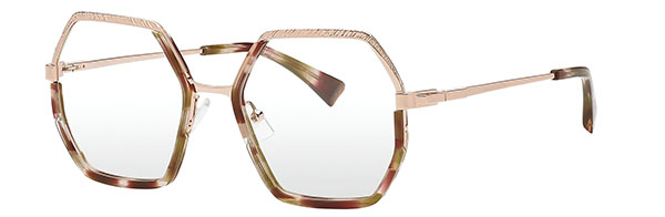 Le linee e le scelte cromatiche rimandano a un mondo di natura incontaminata, di bellezza e maestosità dell’ambiente montano e dei suoi elementi: il verde degli alberi, il marrone della terra con tocchi di giallo e sfumature di rosa che ricordano i fiori. La graffiatura sul metallo e gli originali tagli degli acetati aggiungono un tocco di esclusiva personalità alle montature.