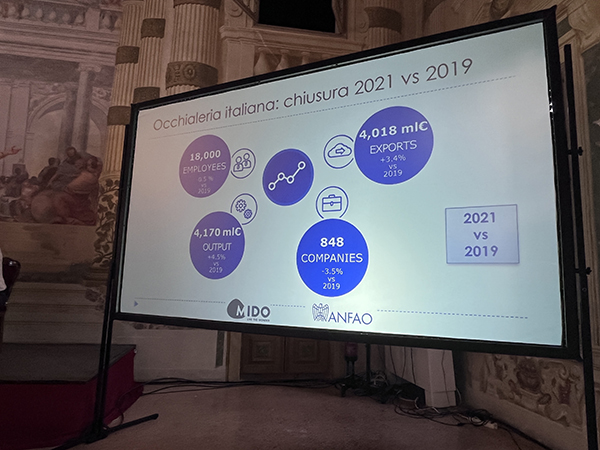 Nello specifico, la produzione dell’occhialeria italiana nel 2021 è stata di 4,17 miliardi di euro, in crescita del 35% rispetto al 2020, e le esportazioni sono cresciute del 39,9% rispetto all’anno precedente, superando di poco i 4 miliardi di euro.
