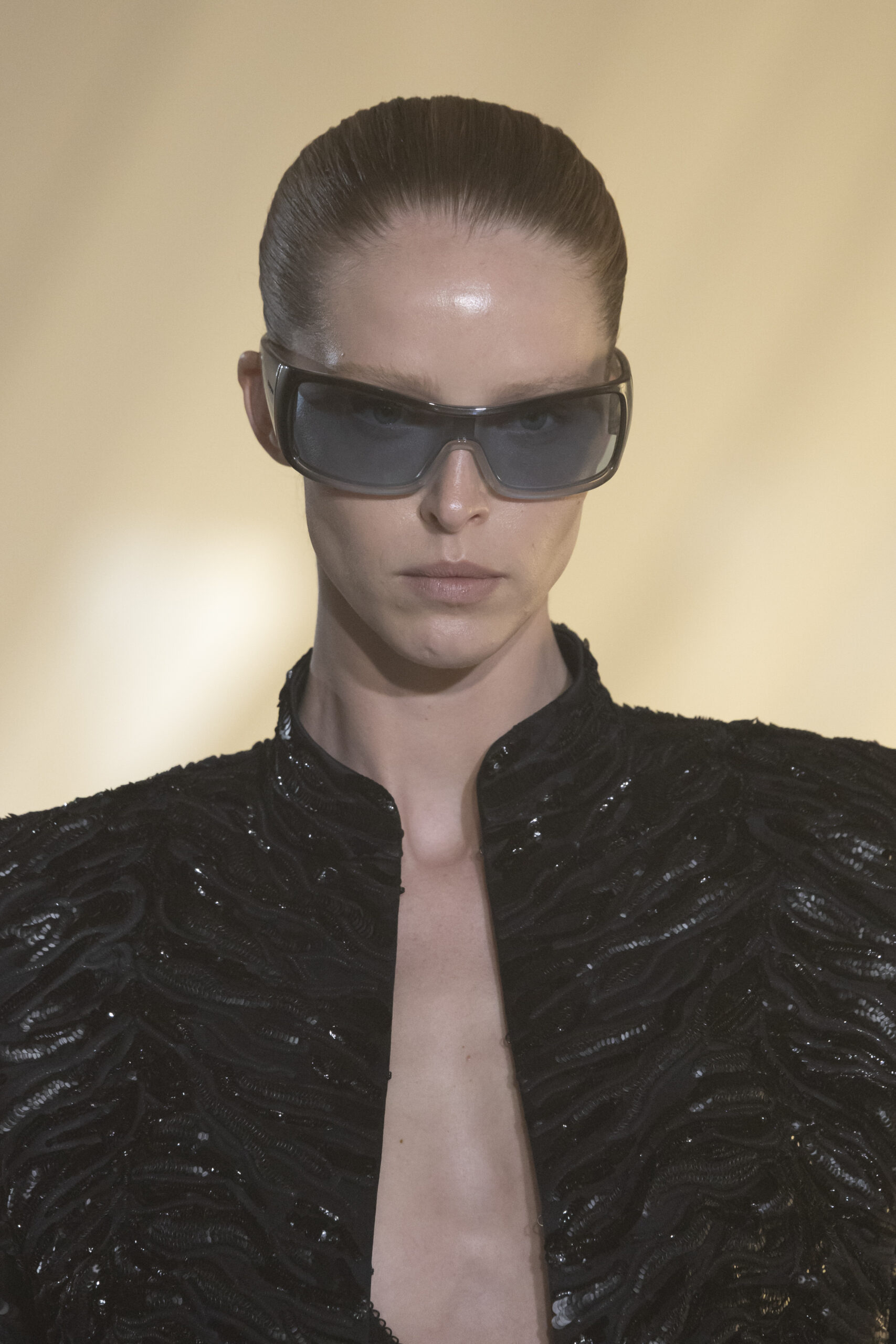 L’edizione gioiello Amelia è impreziosita da un ornamento scultoreo in metallo sulle aste, completato da cristalli pavé che richiamano l’alta gioielleria vintage. Questa fusione di artigianalità italiana e design contemporaneo porta un tocco di fascino parigino direttamente in passerella.