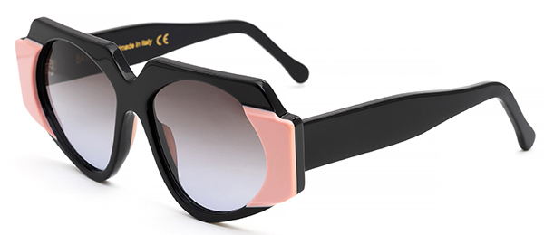 Occhiali dai forti effetti materici: la tridimensionalità data dagli intagli negli oculari si ispira alle geometrie e al simbolismo dell’arte di Angeli, mentre l’uso del colore predominante alle tele monocrome di Festa.