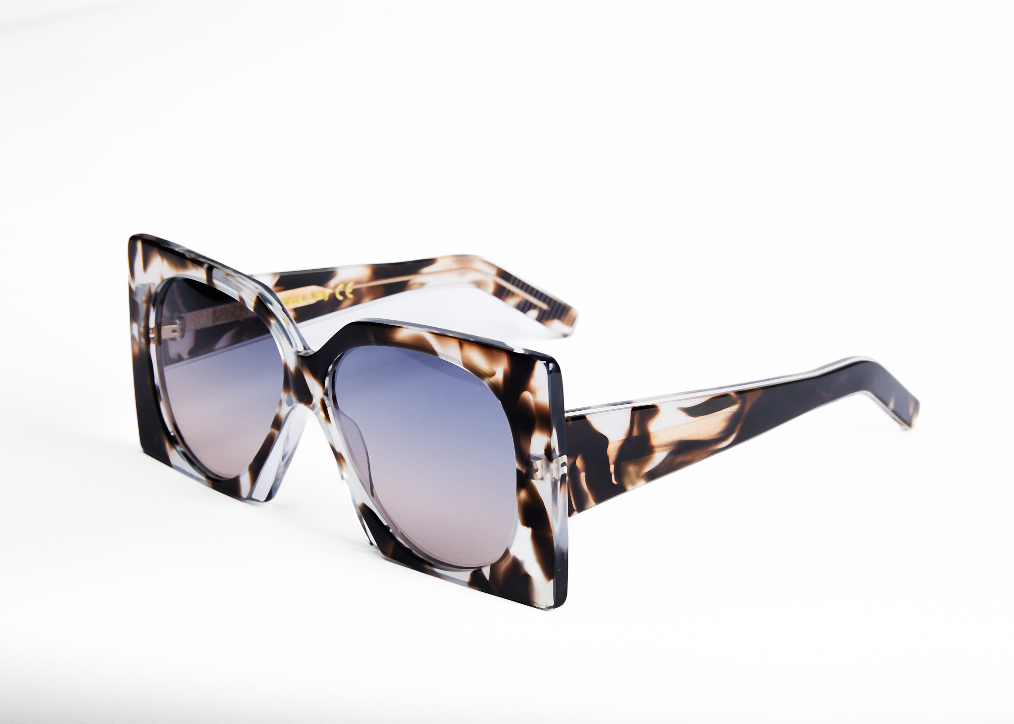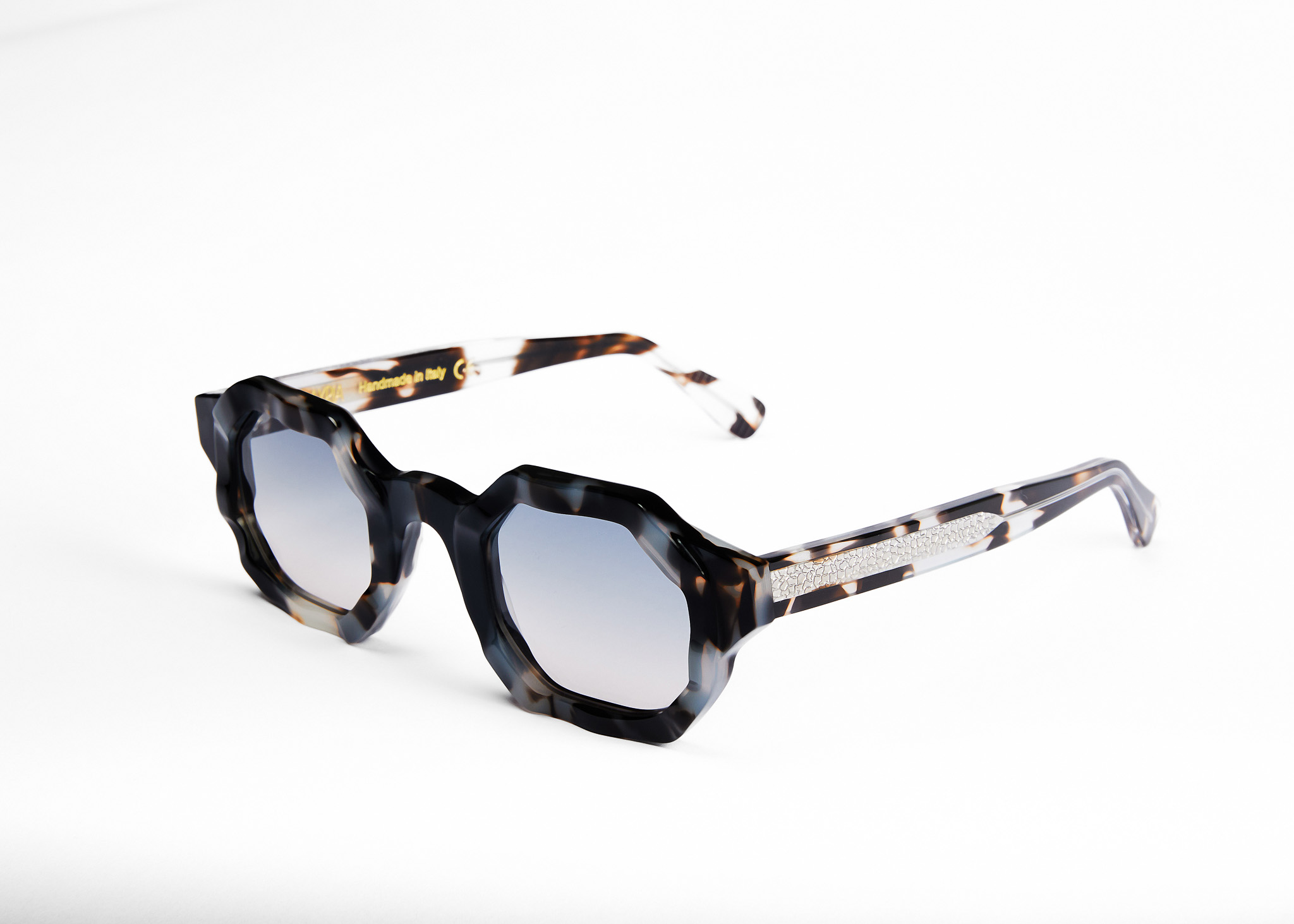 Le nuove montature, infatti, rispecchiano l’esplorazione visiva di Kandinsky, trasformando un accessorio quotidiano in una dichiarazione estetica, creando un linguaggio visivo che comunica direttamente con l’anima. E così, modelli extralarge con angoli pronunciati e ben definiti, dal design avvolgente, vengono resi leggiadri da un ponte nasale delicato e sottile che bilancia l’imponenza delle lenti e delle aste. L’acetato con lavorazione maculata sovrappone tonalità di blu, marrone e giallo a una base trasparente, con effetto visivo dinamico e unico. La combinazione di colori evoca una sensazione di movimento e fluidità, richiamando l’arte astratta.