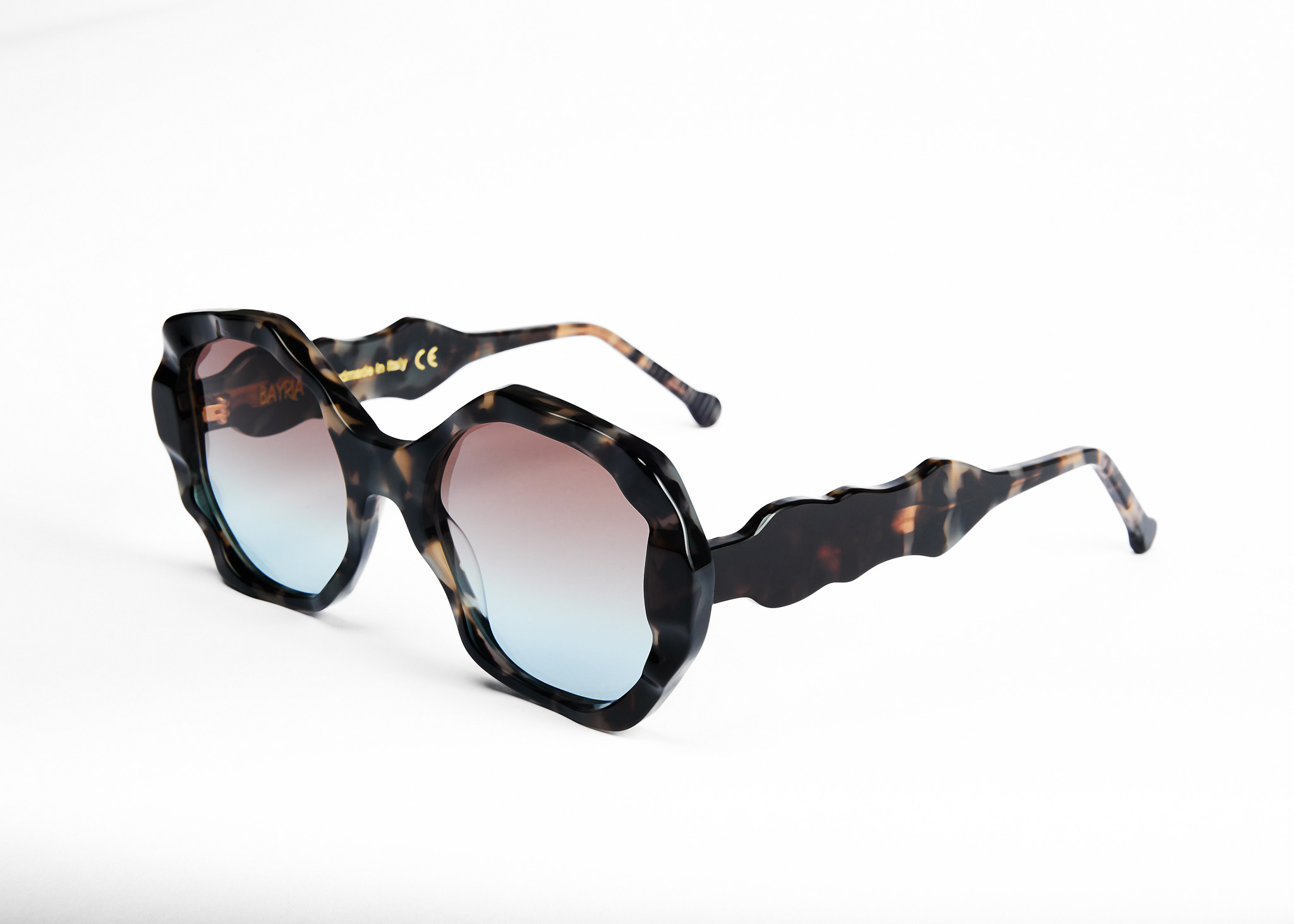 Accanto a questi modelli ampi, troviamo modelli a goccia, con angoli leggermente smussati e una lavorazione del frontale a onde, che conferisce alla montatura un’idea di movimento costante. Come Paul Klee esplorava la potenza espressiva delle forme semplici e dei colori, combinandoli in composizioni che evocano stati d’animo e concetti complessi, allo stesso modo, Bayria Eyewear gioca con geometrie lineari, animate da texture eteree. Le aste lasciano intravedere un’anima metallica, arricchendo ulteriormente l’estetica dell’occhiale.