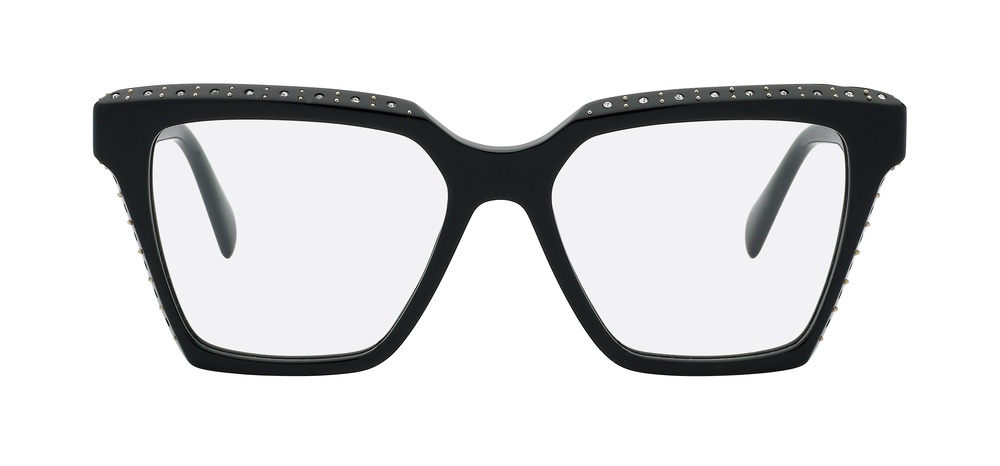 Il modello da vista VBM857S, indossato invece nel secondo scatto, è in acetato dalla forma ampia e squadrata per uno stile contemporaneo. 86 micro-cristalli e 180 borchie adornano il profilo della montatura, dal frontale alle aste, per un look brillante e sofisticato.