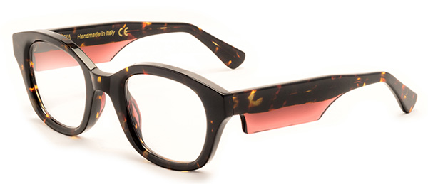 Si tratta di un modello pantos con la peculiarità dell’asta a bandiera bicolor e lente a contrasto. Anche qui le montature in acetato tridimensionale sono arricchite da dettagli caratterizzanti e modellate per dare effetti naturali grazie alle incisioni e ai giochi di colore.