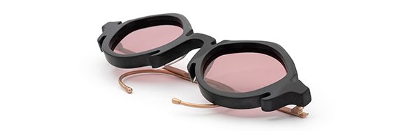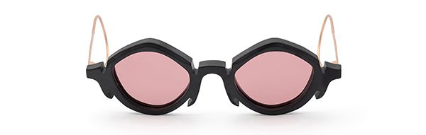 Il frontale di questo modello unico e sinuoso, realizzato in soli 100 pezzi numerati, presenta ghirigori che portano alla mente i capitelli ionici della facciata del palazzo Mincuzzi, rigorosamente in acetato nero Osaka opaco, lo stesso nero che ricorre in tutto il design dell’edificio, dalle ringhiere interne all’insegna.