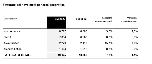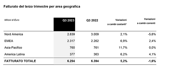 L’America Latina ha registrato ricavi pari a 377 milioni di Euro, in crescita del 6,2% rispetto al terzo trimestre 2022 (+4,1% a cambi correnti), in leggera decelerazione rispetto al trimestre precedente.