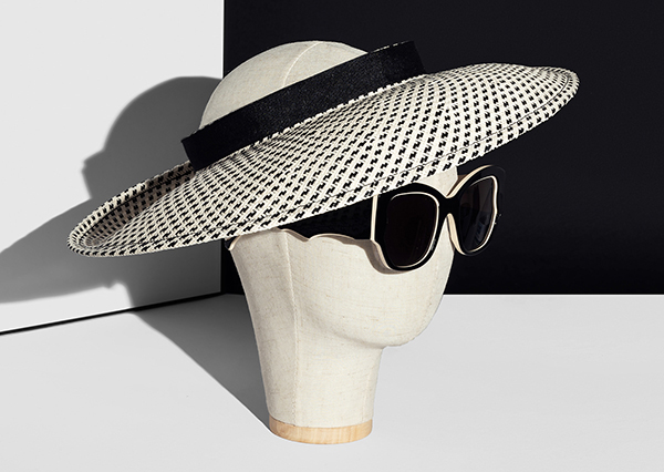 Il cappello Bonfilio Hats abbinato a questa estrosa montatura è anch’esso in beige e nero, realizzato in 40 pezzi in carta riciclata, con un’anima in metallo, che permette alla falda di essere modellata e assumere di volta in volta fogge differenti.