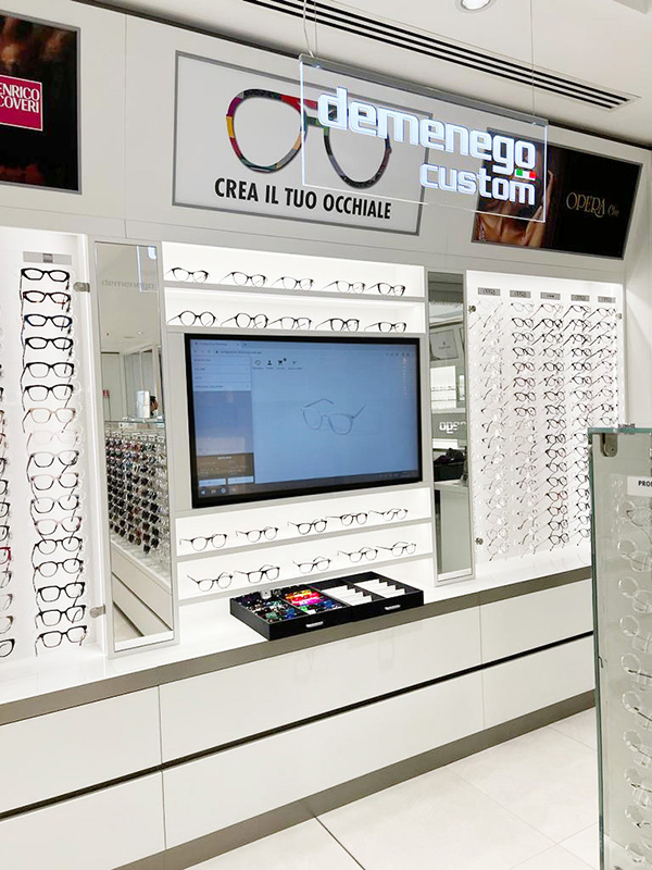 All’interno dell’ottica, come in tutti i punti vendita Demenego, sono presenti tre spazi dedicati: una sala per il controllo della vista attrezzata con tecnologie all’avanguardia con una postazione per l’applicazione delle lenti a contatto e un laboratorio a vista che permette al cliente di seguire da vicino la realizzazione del suo occhiale completo di lenti oftalmiche, con la consegna possibile in 30 minuti per lenti già presenti in magazzino.
