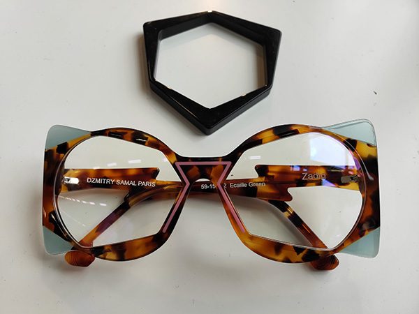 “Lavoriamo con l’atelier che ci produce gli occhiali e sono stati loro a proporci di creare gli accessori a partire dallo stesso materiale, cioè l’acetato – precisa Dzmitry – . Gli accessori hanno dunque il medesimo concetto dell’eyewear: sono forme geometriche, commistioni tra di esse come un ovale con un trapezio e un quadrato. L’ispirazione principale arriva proprio dalla geometria; è una delle cose che amo di più perché produce immagini facili da ‘leggere’, da notare, e crea anche un effetto grafico“.