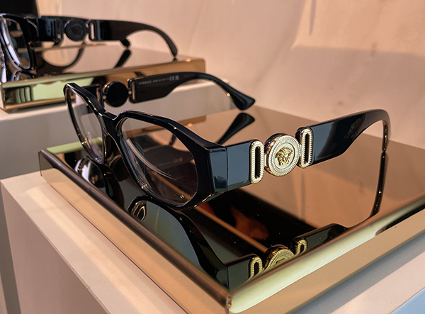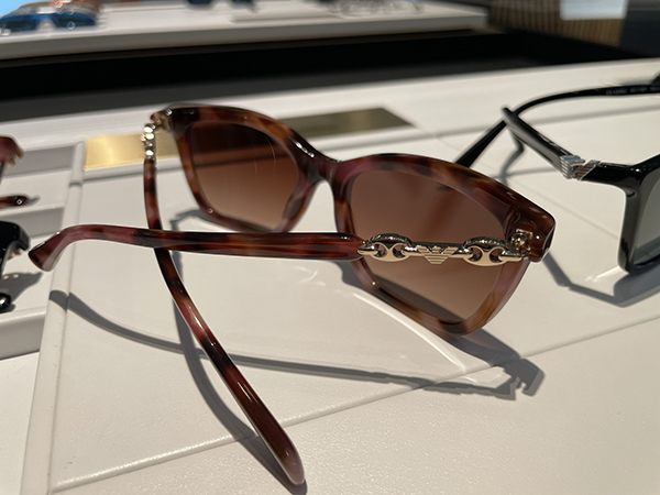 Per Emporio Armani, spicca anche un modello femminile che esplora la sinergia tra accessori cross-categoria. Elementi presenti su borse, bracciali e orecchini si riflettono anche sugli occhiali, con un gioco di pieni e vuoti sull’asta. Il design si arricchisce con innovazioni come l’inserimento di una lente su un modello squadrato, dove la cerniera, oltre a essere funzionale, si trasforma in un dettaglio di design grazie alla presenza dell’aquilotto. Le particolari colorazioni delle lenti rafforzano l’unicità del modello.