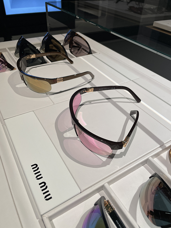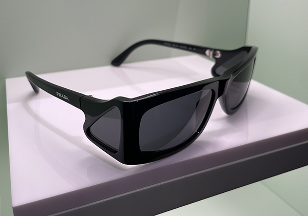 Anche Prada continua a esplorare il tema della logomania discreta. Interessante l’occhiale a quattro lenti, dove quella laterale riprende il logo triangolare dell’azienda, offrendo una visione più discreta e raffinata del marchio.
