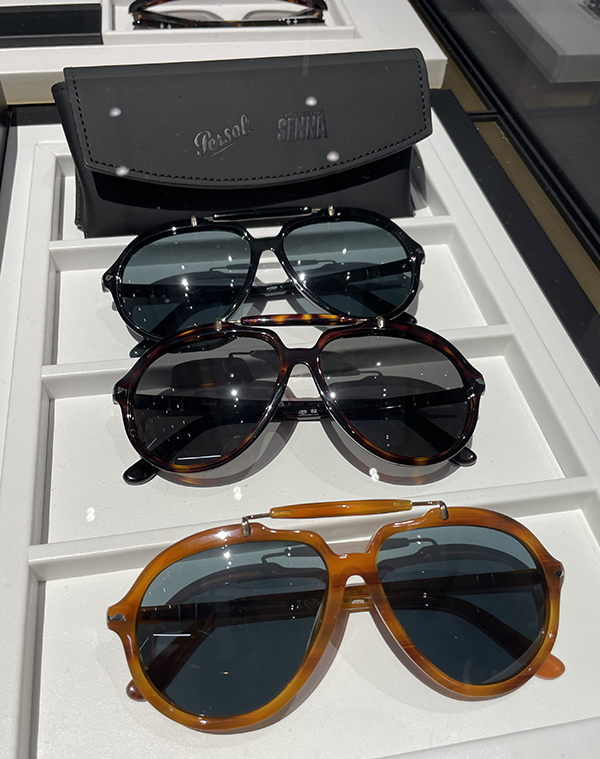 In evidenza il modello Persol Senna, dedicato alla miniserie su Ayrton Senna, con ponte in metallo e acetato e con lenti sfumate che aggiungono un tocco vintage ed elegante alla collezione.