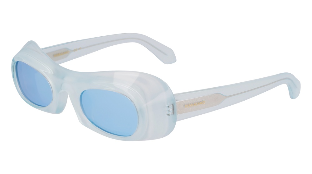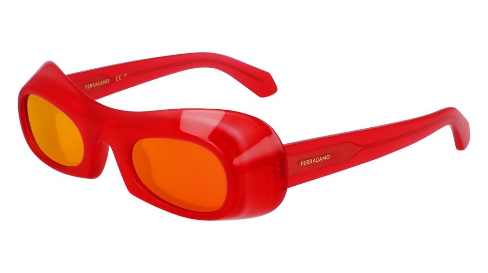 L’occhiale da sole unisex presenta una forma ovale dal tratto estremamente contemporaneo, con una costruzione esclusiva che riflette i concetti di fluidità e movimento. La silhouette avvolgente è definita da un frontale curvo con sezioni in rilievo e spoiler laterali che amplificano il design ad alto impatto. L’acetato lucido è rifinito con una tecnica di fresatura manuale particolarmente visibile sulla parte superiore quale ulteriore richiamo all’eccellenza artigianale di Ferragamo. Il logo è stampato a caldo sulle aste che, nelle colorazioni trasparenti come il New Red, il Lavender e il Light Blue, svelano anche un’anima in metallo luminoso arricchita con una finitura sabbiata.
