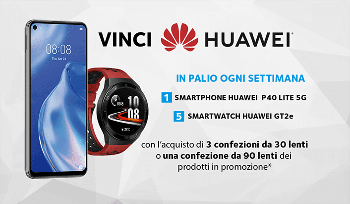 In palio ci sono 1 Smartphone Huawei P40 Lite 5G e 5 Smartwatch Huawei GT2e. In più, per ogni giocata valida, il cliente riceve sempre un buono sconto del valore di 5,00 € per riacquistare i prodotti coinvolti nella promozione. Infine, per ogni vincitore estratto, sarà premiato anche l’ottico presso cui è stato effettuato l’acquisto, con 5 pack gratuiti da 30 lenti a contatto della stessa tipologia scelta dal cliente vincitore.