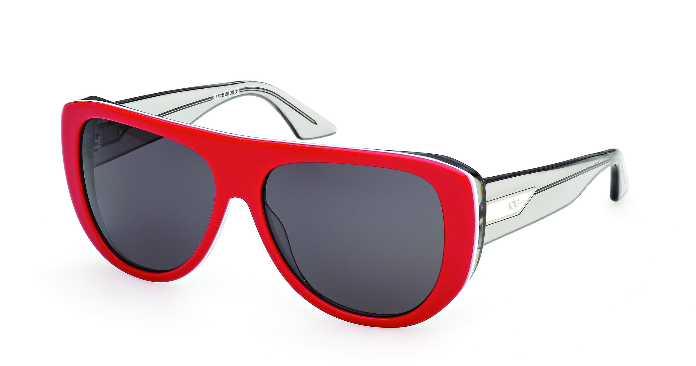 Una silhouette classica reinterpretata con audacia. La montatura rossa vibrante è arricchita dal monogramma GCDS interno al frontale e alle aste, celebrando il 10° anniversario del brand.