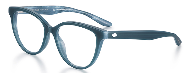 Gli occhiali sono disponibili in due misure, nel­le due raffinate colorazioni marrone e petrolio, entrambe con effetto marmorizzato a contrasto.