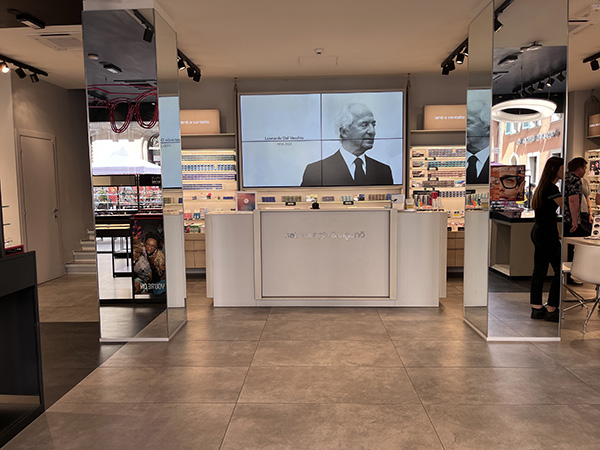Per salutare il feretro del Cav. Del Vecchio, molte delle maestranze che hanno partecipato alle esequie hanno indossato la divisa con i pantaloni e la maglietta blu che riportava cucito lo stemma dell’azienda. Le due catene legate al Gruppo EssilorLuxottica invece, hanno deciso di rendere omaggio al fondatore esibendo nelle vetrina (nel caso di Grand Vision) e nel ladwall sopra il bancone (nel caso di Salmoiraghi&Viganò) di tutti i punti vendita, un ritratto di Leonardo Del Vecchio corredato della data di nascita e morte.