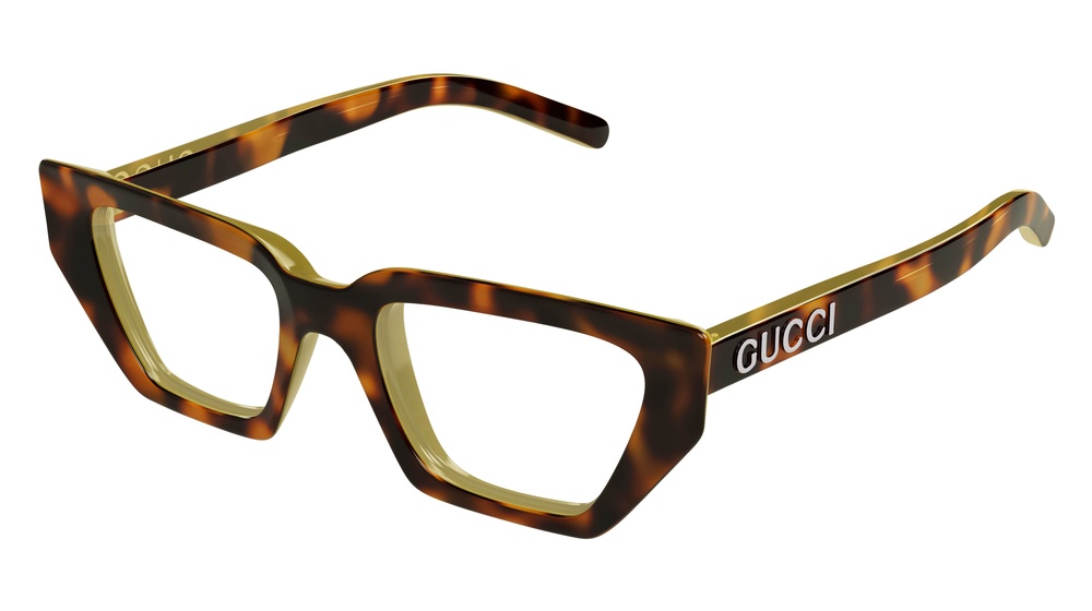 GG1720O: Occhiale da vista con silhouette cat-eye arricchita con una finitura sfaccettata e con il logo Gucci smaltato a rilievo sulle aste lineari.