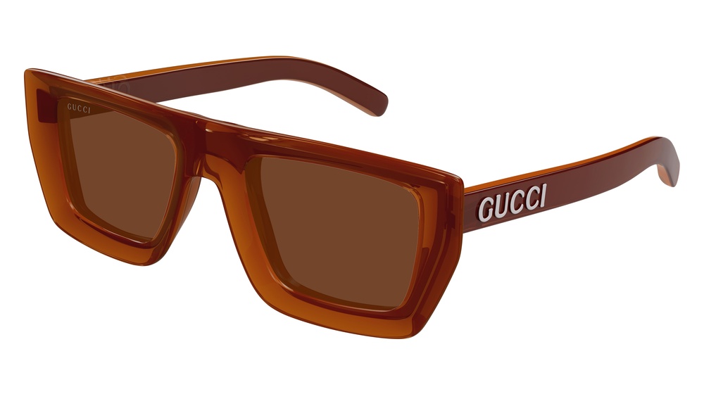 GG1723S: Montatura da sole squadrata con angoli accentuati, finitura sfaccettata sul frontale e aste lineari con il logo Gucci smaltato a rilievo.