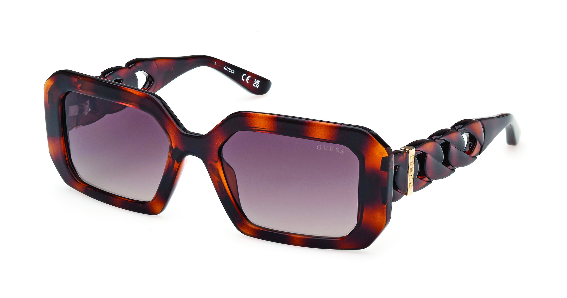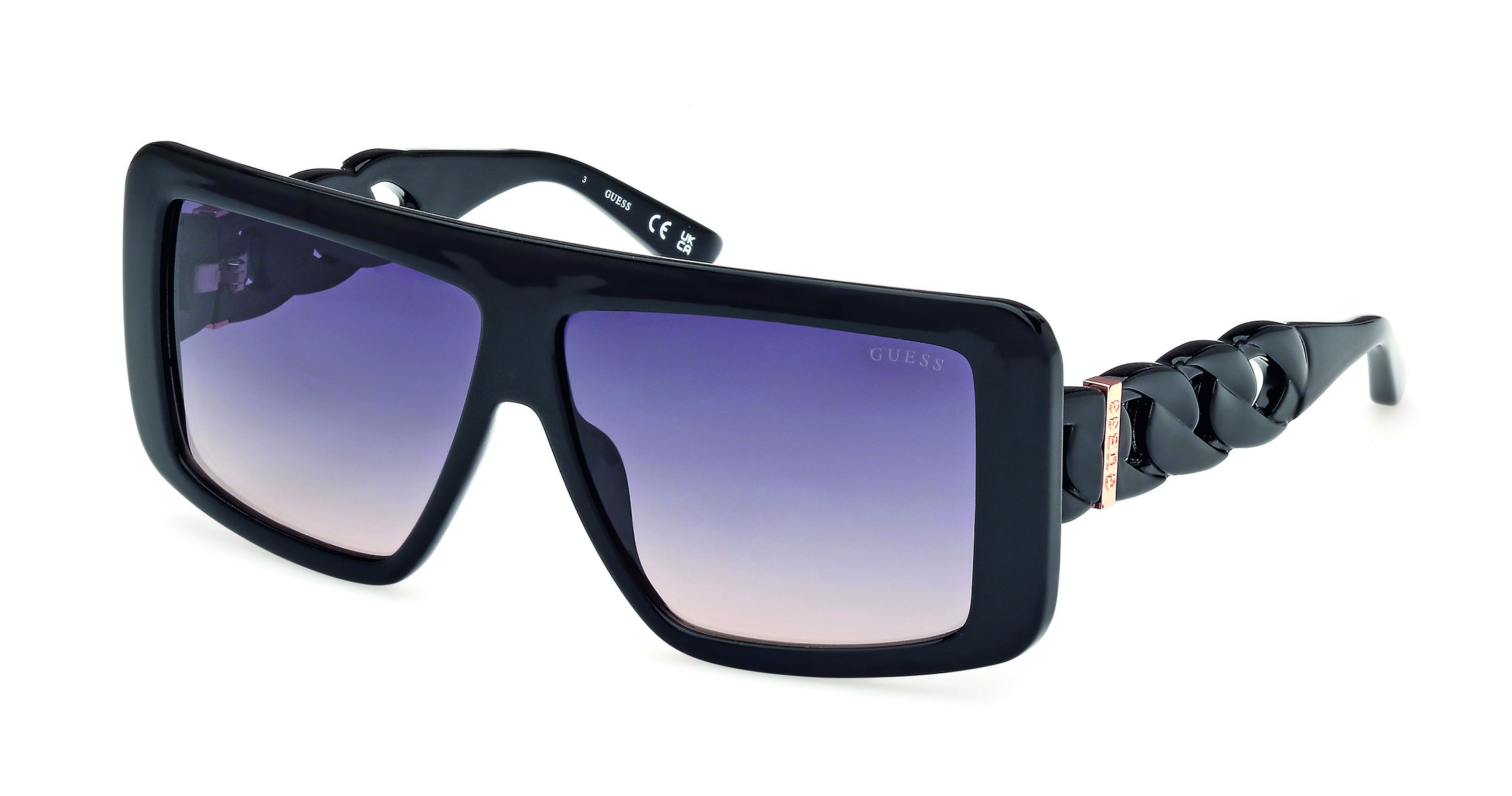 Modello da sole in iniettato con frontale geometrico. La montatura è caratterizzata dal nuovo design delle aste, che riproduce l’iconica chain GUESS personalizzata dal logo in rilievo inserito su una preziosa placchetta in metallo.