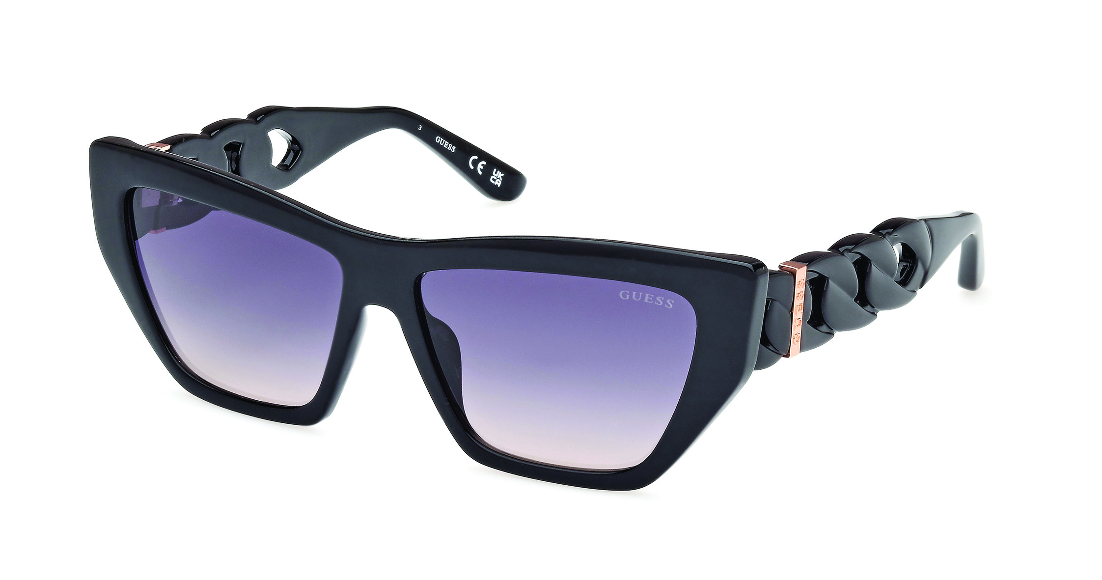 Modello da sole con frontale squadrato. La montatura in iniettato è caratterizzata dal nuovo design delle aste che riproduce l’iconica chain GUESS ed è personalizzata con il logo in rilievo inserito su una preziosa placchetta in metallo.
