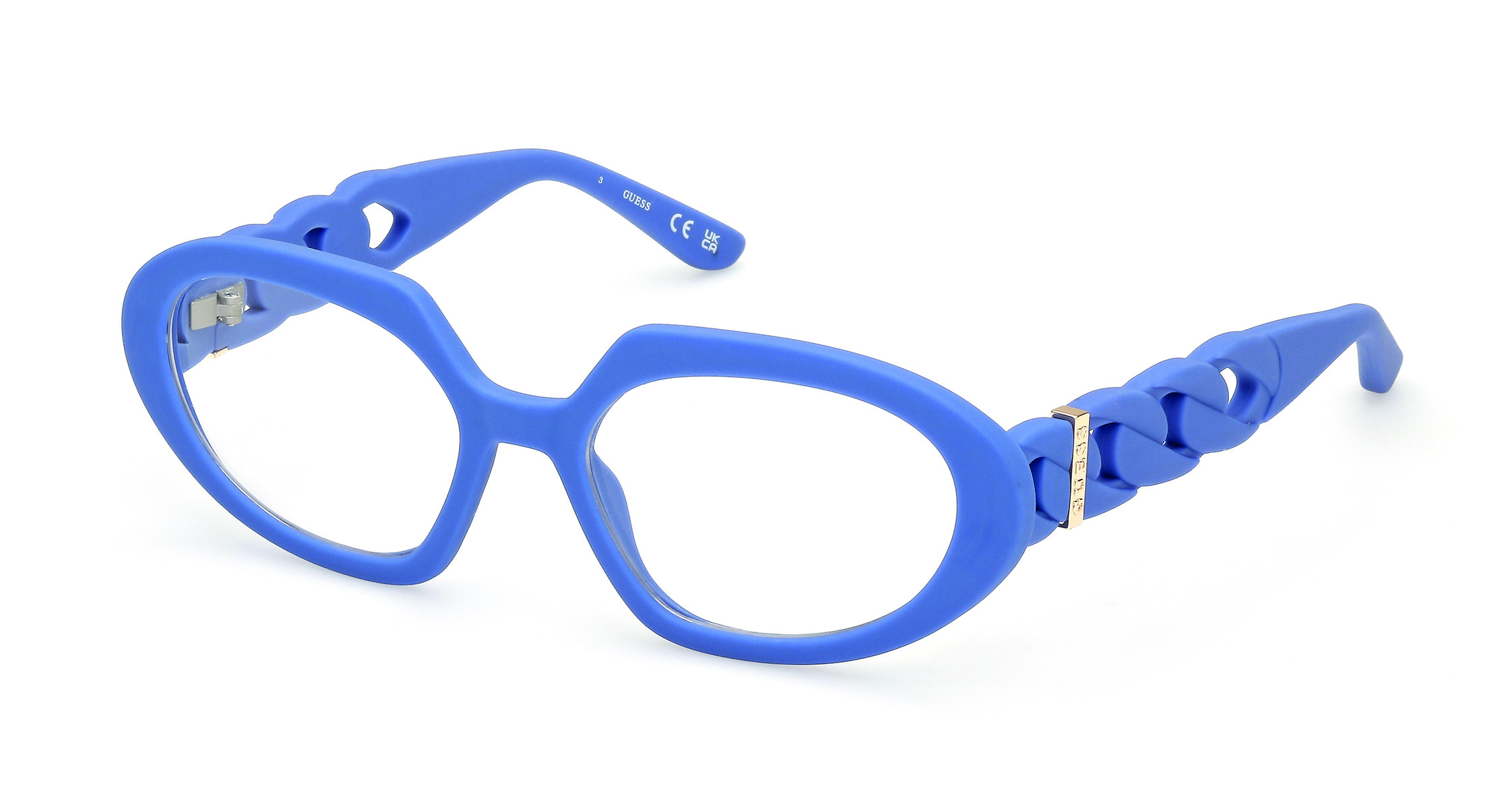 Modello da vista con frontale ovale esaltato da moderne geometrie. Le aste sono protagoniste del design, costruite con l’inedita forma a catena e personalizzate dal logo GUESS, inserito su una preziosa placchetta verticale in metallo.