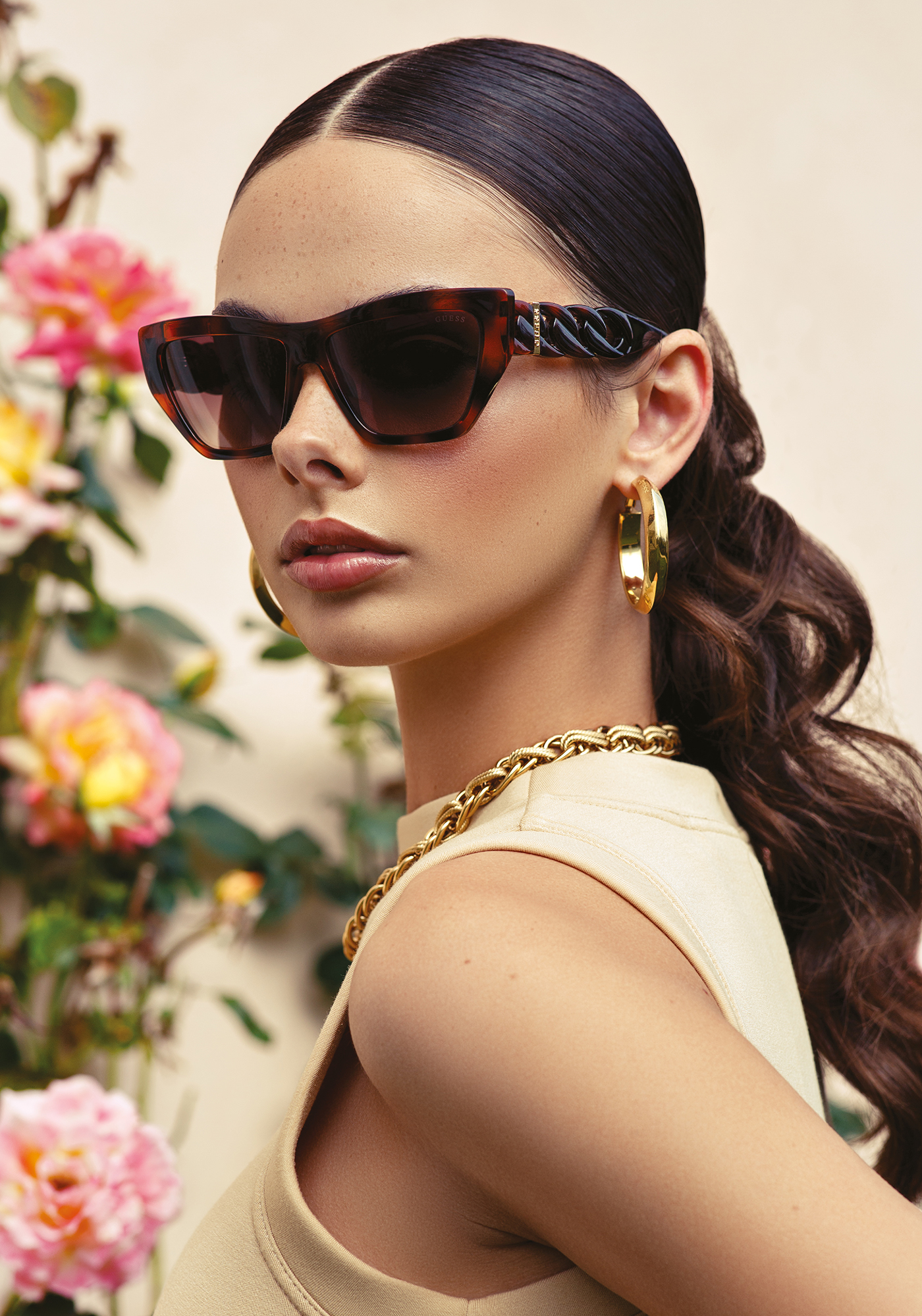 Modello da sole con frontale dalla forma cat-eye, ridisegnato da profili con angoli ricercati. La montatura presenta l’innovativa costruzione delle aste che riproduce l’iconica chain presente sugli accessori del brand.