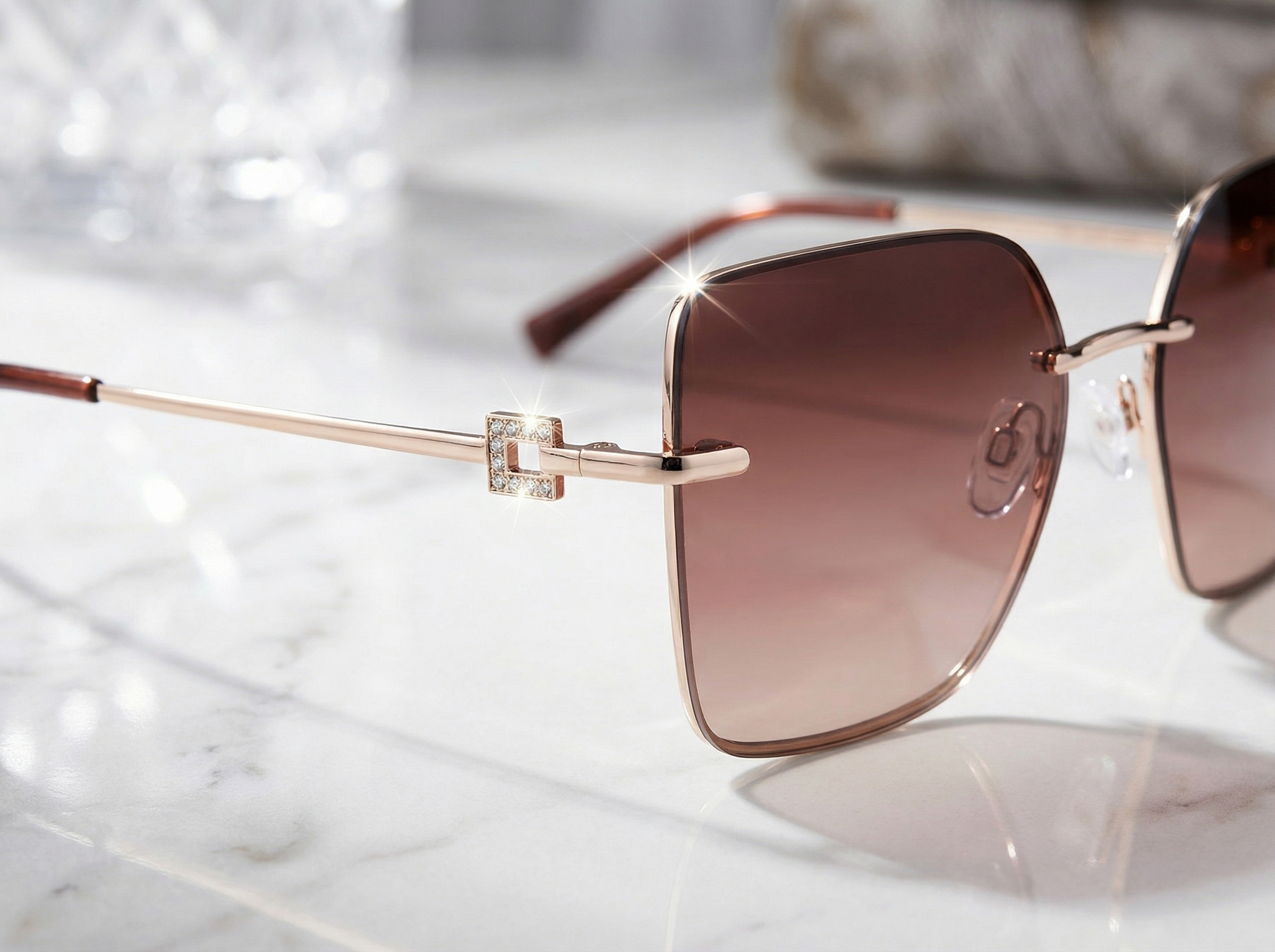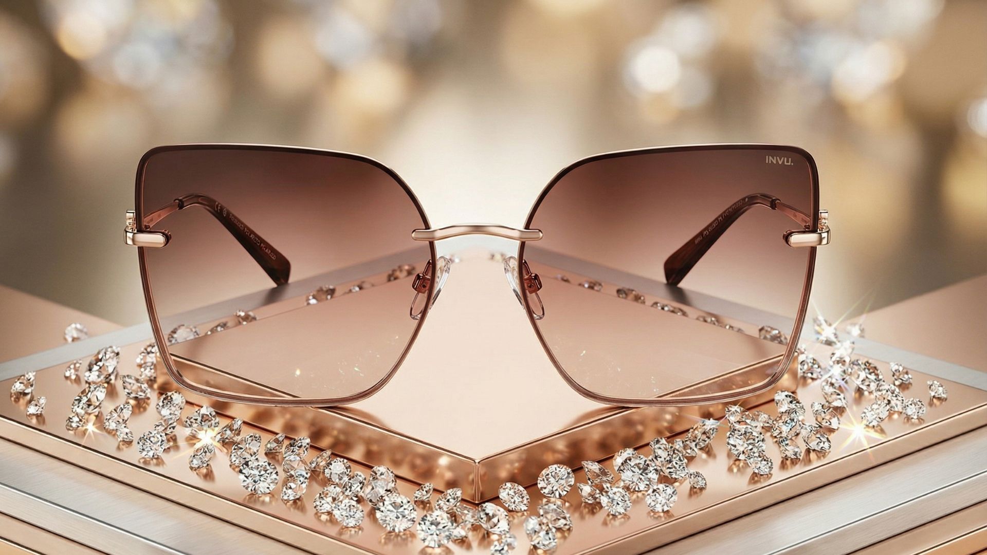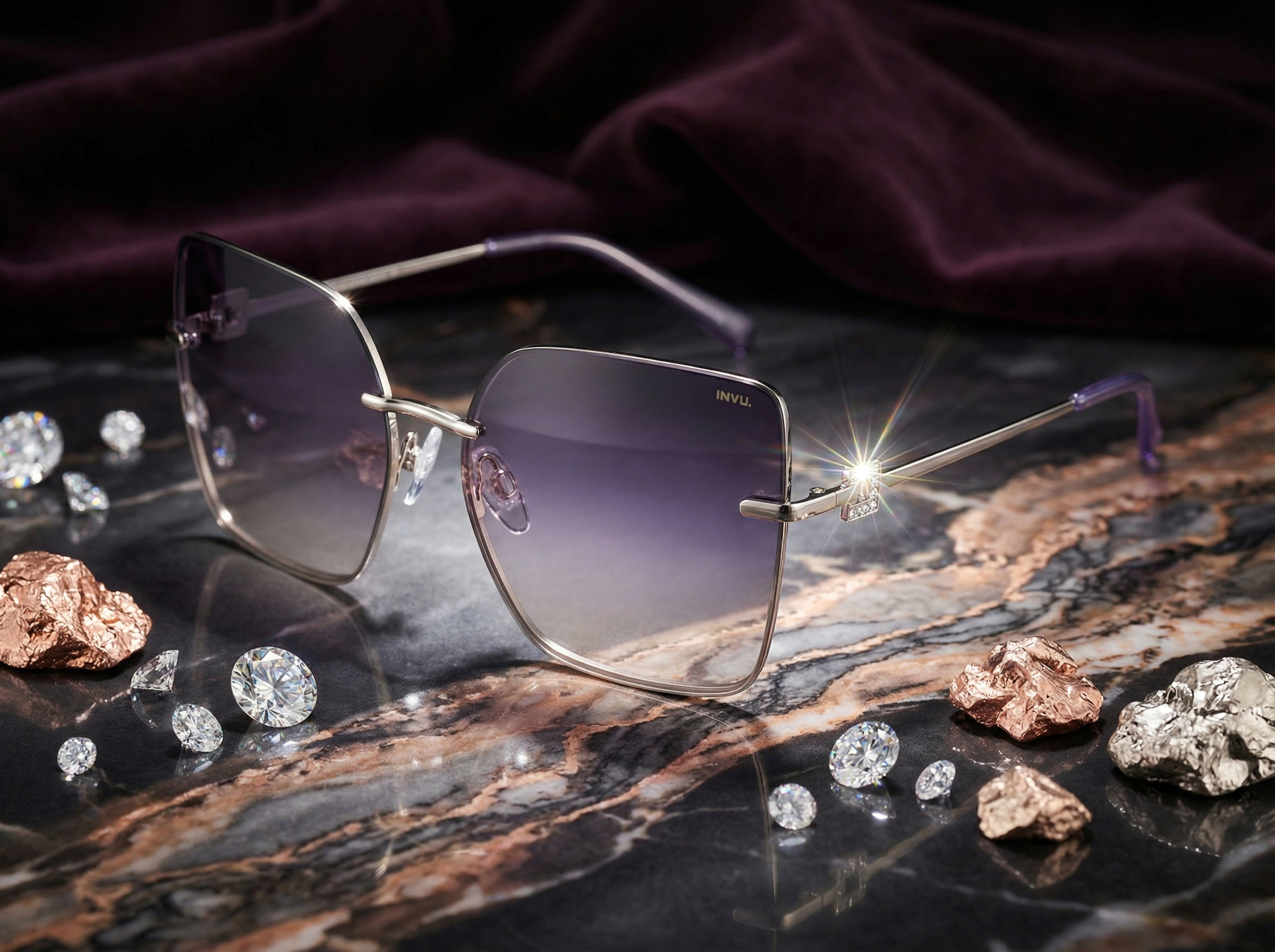 Le montature si vestono di oro rosa e oro bianco, esprimendo un’estetica preziosa e distintiva. Le aste, arricchite da punti luce brillanti, aggiungono un tocco di luminosità che amplifica l’effetto scenico senza rinunciare all’eleganza. Protagoniste assolute anche le lenti: leggere, sfumate e progettate per lasciare intravedere lo sguardo. Una scelta stilistica precisa, che mette al centro l’espressività e il carattere di chi indossa questi modelli INVU.