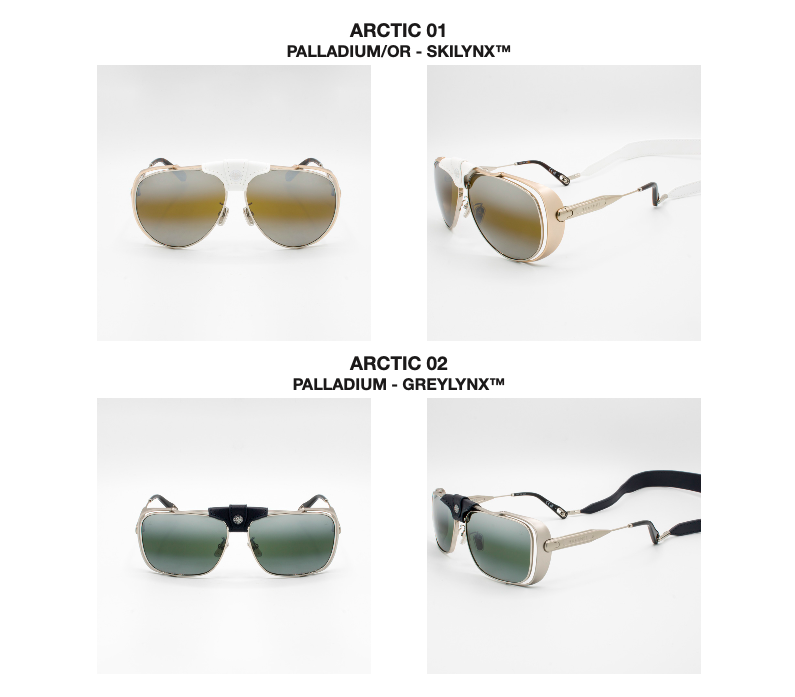 La famiglia Atelier si ispira all’esplorazione della montagna e combina eleganza, raffinatezza, leggerezza e protezione con stile. Gli Arctic 01 e 02 si aggiungono agli iconici modelli Glacier. Entrambi sono dotati di rinforzi laterali, ponte nasale rimovibile e cordino in pelle. Realizzati in titanio giapponese e vera pelle, entrambi i modelli sono dotati delle iconiche lenti minerali Vuarnet. L’Arctic 01 ha una forma da pilota, mentre l’Arctic 02 opta per un audace design rettangolare.
