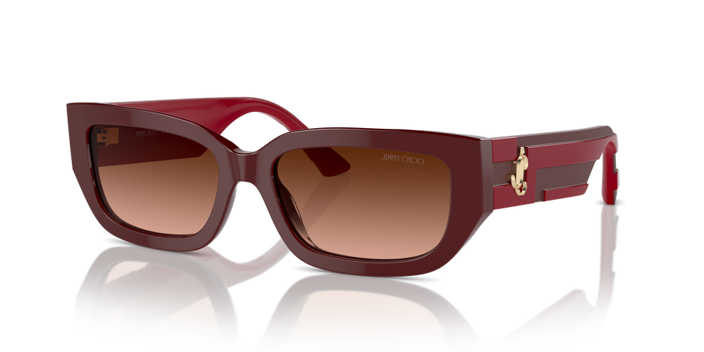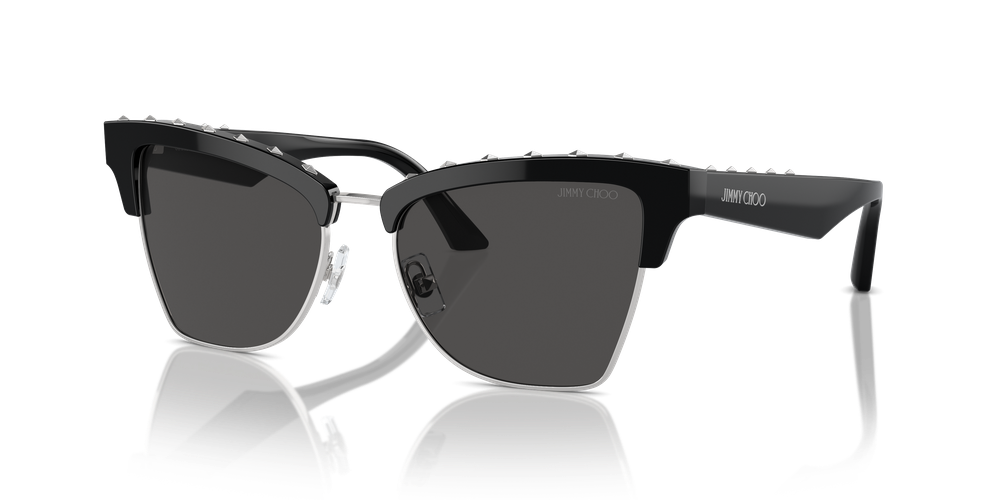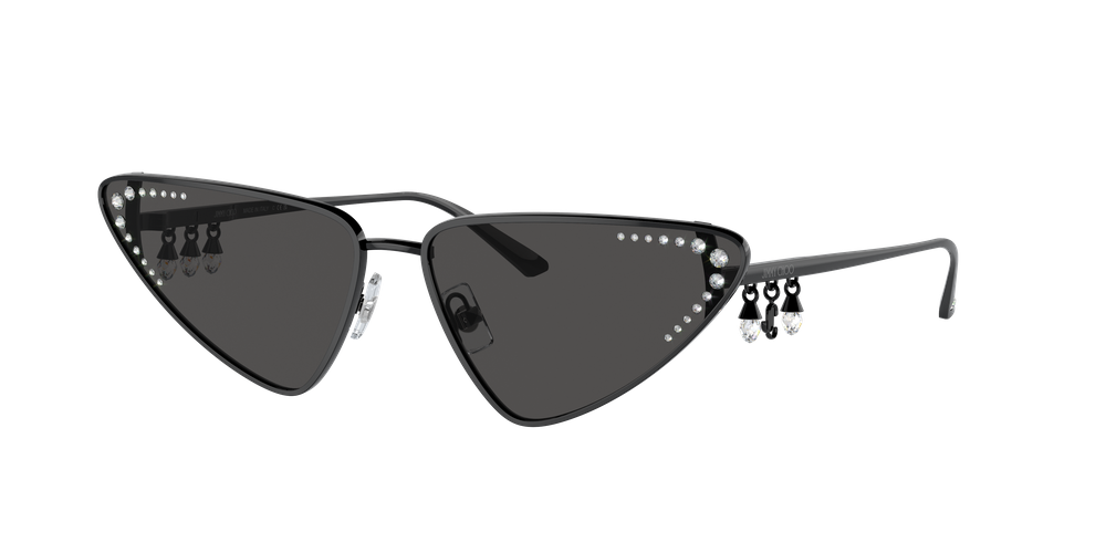Innovazione e artigianalità si combinano per dare vita a una montatura grafica in metallo dalla silhouette cat-eye, impreziosita da pietre scintillanti sulle lenti. La sottile asta con logo Jimmy Choo inciso sorregge delicati pendenti in cristallo, che si armonizzano in un gioco asimmetrico con il ciondolo JC in metallo sul lato sinistro. Modello disponibile in nero e canna di fucile con lenti grigio scuro e in oro pallido con lenti marrone scuro.