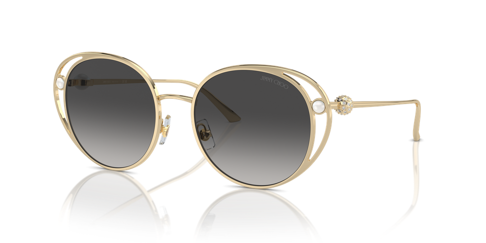 Un elegante modello da sole in metallo con delicate perle che lo impreziosiscono: una perla singola e il logo Jimmy Choo a destra, una perla tempestata di cristalli a sinistra e una perla cabochon applicata su ciascun lato della montatura. Espressione di raffinatezza sofisticata, la silhouette è proposta in oro pallido con lenti grigio sfumato.