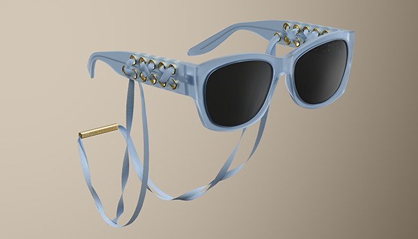 L’ispirazione “corsetto” è evidente nelle aste oversize dal design unico, caratterizzate da un intreccio di nastri in grosgrain di seta collegati da una perlina placcata oro 24K con logo, da utilizzare per indossare l’occhiale intorno al collo.