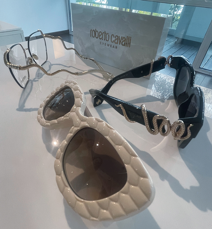 Il simbolo del serpente domina la collezione Serpentine, declinato in versioni preziose come l’edizione speciale The Snake, il motivo effetto quilted snake e lo stile sinuoso delle aste. L’iconografia del brand si esprime anche attraverso il Fang (dente di tigre) e il logo Mirror Snake, enfatizzando il carattere distintivo di Roberto Cavalli.
