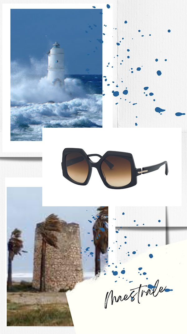 Il modello Maestrale, sempre di Mic, Made in Cadore, a dispetto del nome – vento del nord-ovest che porta il freddo –, è una ventata di estro, con la sua forma esagonale irregolare, che regala un look da diva sbarazzina, che desidera schermare i raggi del sole. Qui in versione tartarugata, citazione delle tonalità calde degli alberi del bosco che si risvegliano.