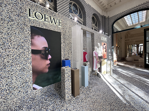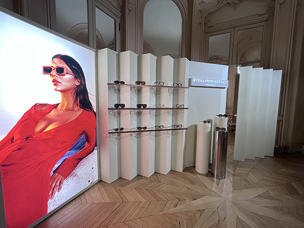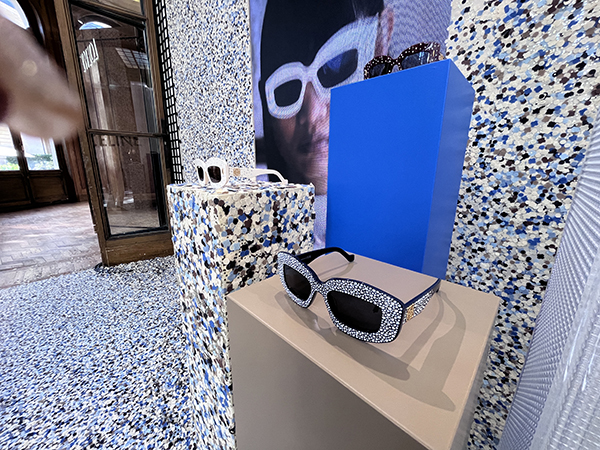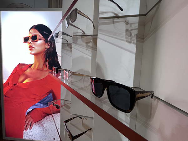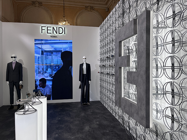 Si comincia con Fendi il cui allestimento è ispirato alle ultime sfilate del brand che prosegue il percorso del total look dove l’occhiale diventa parte integrante del concept. In ogni modello viene data molta importanza al logo il cui design viene scelto a seconda della shape. Come il classico logo baguette o quello con le due F incrociate che trova posto come pattern anche sulle lenti attraverso una stampa laser. Della collezione fanno parte anche modelli in acetato trasparente, di grande tendenza quest’anno, dalle forme più minimaliste rispetto alla collezione precedente, modelli in metallo e shape dalle forme sportive.