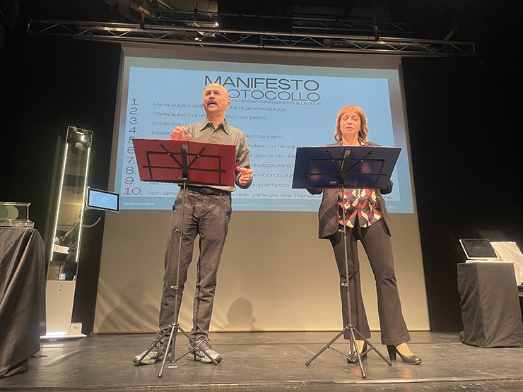 A sipario quasi chiuso, quando il pubblico crede di aver visto tutto, ecco il colpo di scena. Due figure, fino a quel momento perfettamente integrate nel pubblico come ottici professionisti, avanzano al centro del palco. Sono Alessandra Sarno e Giorgio Centamore, due bravissimi attori che, dopo aver vestito i panni di professionisti del settore durante la mise en scène, si svelano in una veste completamente nuova. Con tempismo impeccabile, i due danno vita a una breve ed esilarante rappresentazione teatrale scritta appositamente per l’occasione, un omaggio ironico e brillante al mondo dell’ottica. Il pubblico, sorpreso e divertito, si lascia trasportare in un finale inaspettato, dove il rigore della presentazione lascia spazio all’intrattenimento puro. Un modo leggero e intelligente per chiudere la serata, dimostrando che, anche nel mondo della visione, l’arte e la creatività possono fare la differenza.