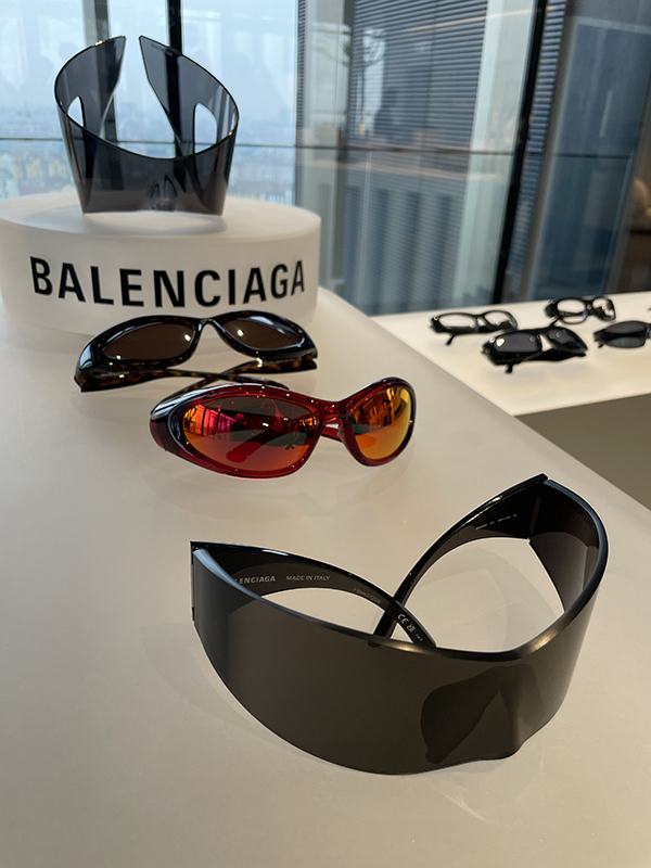 Balenciaga, rimane fedele a se stesso e si distingue per la sua continua ricerca di innovazione nel design. Tra i modelli più rappresentativi della stagione troviamo l’iconica maschera, che fa da padrone nella collezione, seguita da modelli caratterizzati da aste incurvate verso il basso. Il brand continua a giocare con le geometrie e tra le novità spicca il modello che utilizza un elemento decorativo posizionato all’estremità delle aste che rappresenta il simbolo del cacciavite a stella, espressione di forza ed energia. Un’altra montatura rappresenta invece la rivisitazione del classico modello Boss, con il logo applicato direttamente sull’asta.