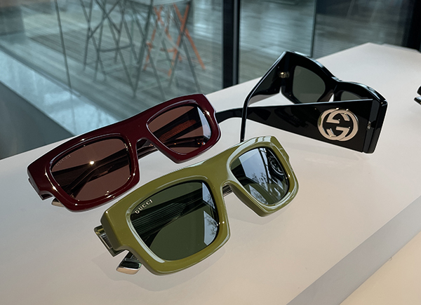 Gucci presenta occhiali all’avanguardia in termini di sostenibilità, con montature in acetato riciclato 100%. Tra le novità troviamo il modello da sfilata oversize in color burgundy. La collezione include anche modelli audaci come la mascherina avvolgente, arricchita da dettagli come il monogramma delle due G big size intrecciate sulle aste. Per gli amanti del design più minimalista, i “metallini” caratterizzati dal lettering del logo in rilievo sull’asta, anche impreziosito da strass e dalle lenti con il logo serigrafato solo sulla parte esterna.