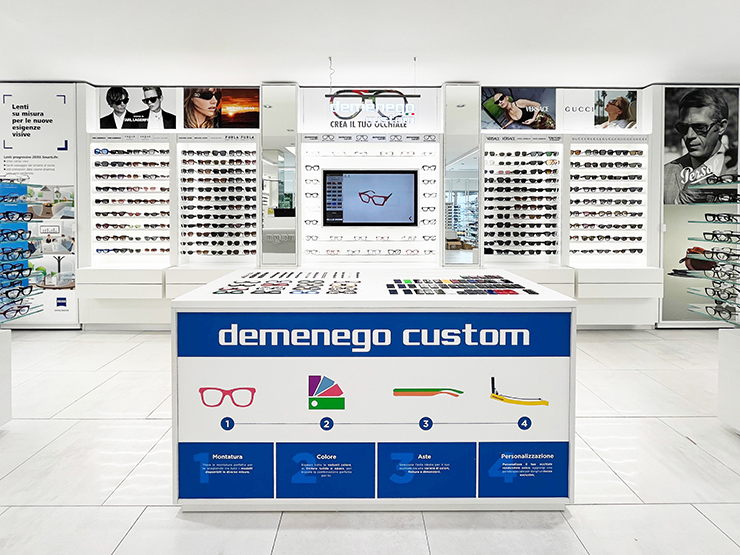 All’interno dello store, il cliente può vivere in prima persona il mondo Demenego Lab: un laboratorio a vista che permette di seguire dal vivo la realizzazione dell’occhiale, garantendo precisione e consegna veloce. Il cuore dell’innovazione è il Demenego Custom, un configuratore interattivo con touchscreen che permette di creare il proprio occhiale su misura, con oltre 500.000 combinazioni tra frontali, aste e colori.