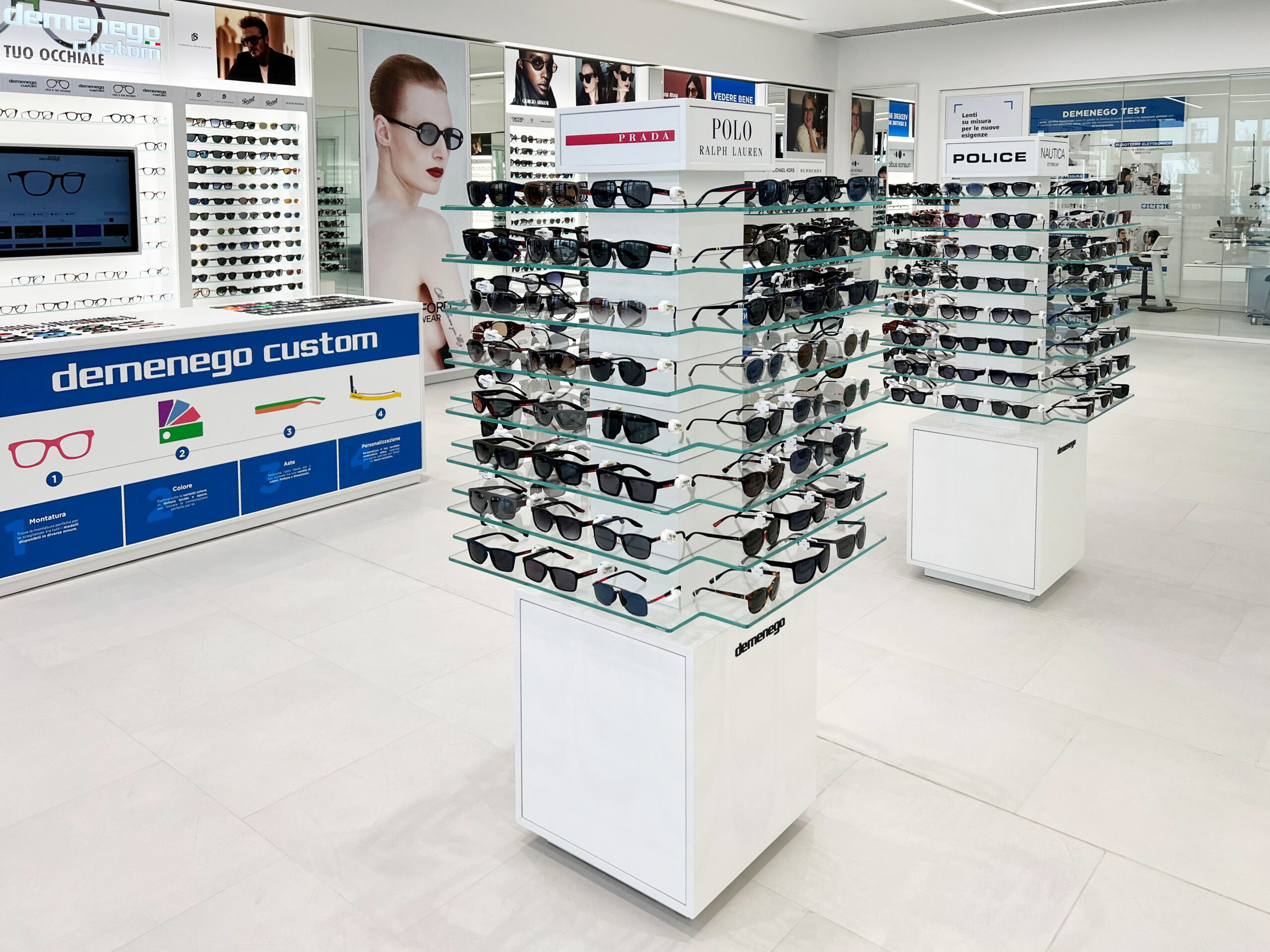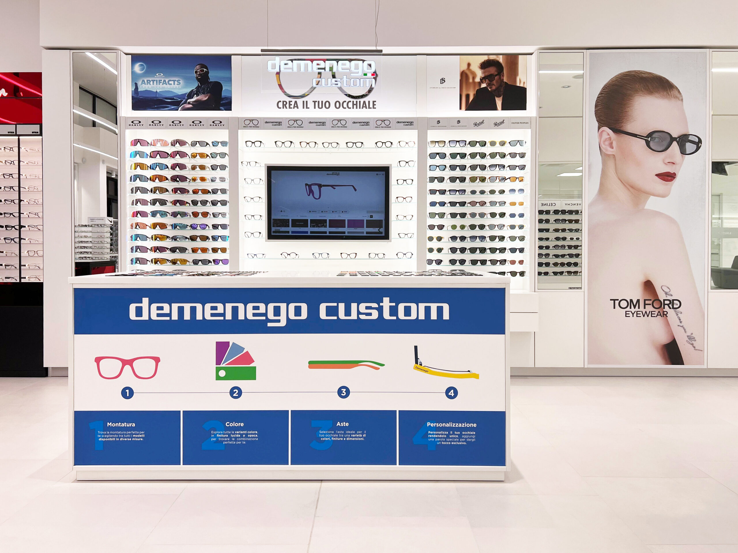 Al centro del negozio si trova il Demenego Lab, un laboratorio a vista dotato di strumenti di ultima generazione che permette ai clienti di osservare in tempo reale le fasi di montaggio degli occhiali, garantendo trasparenza e tempi di consegna rapidi. Uno degli elementi distintivi di Ottica Demenego è il Demenego Custom, un configuratore a parete che consente di creare occhiali personalizzati e su misura. La versione rinnovata introduce nuove cerniere, frontali, aste e colori, permettendo di combinare fino a 600.000 varianti possibili. L’interfaccia riprogettata offre un’esperienza semplice, intuitiva e coinvolgente, mentre un desk espositivo permette ai clienti di esplorare e toccare con mano frontali, aste e campioni di colore, accompagnati dal supporto del personale.