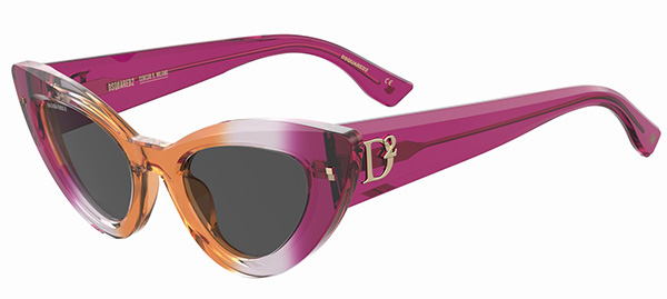 Un cat-eye in acetato trasparente che sfuma dall’arancio al magenta vibrante. Le aste bold ospitano il monogramma oversize