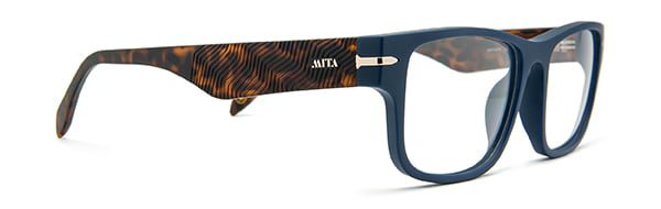 Anche per l’uomo si evidenziano delle silhouette di chiara ispirazione vintage, rivisitate grazie all’utilizzo di materiali fortemente innovativi. Ne è un esempio il modello MIO1004 (nella foto sopra), dalla forma squadrata con un sottile ponte in metallo e la placchetta sulla cerniera che ricorda la “I” di MITA, proposto con lenti blue block nella variante blu denim opaco. Stesse caratteristiche, ma colore grigio opaco con aste avana scuro per il modello MIO1010, che si distingue dal precedente per il taglio rettangolare più classico e l’assenza della top bar in metallo. E ancora il MIO1016, frontale arrotondato senza ponte, in alluminio e titanio, monta le lenti blue block nella versione in doppia tonalità canna di fucile.