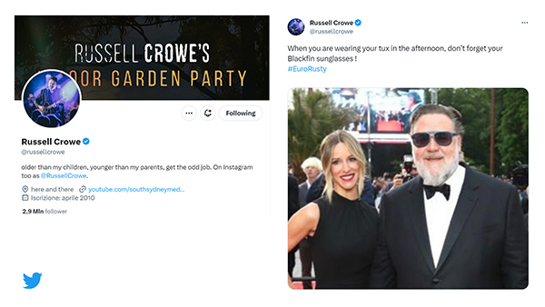 Dopo una settimana intensa in Italia, tra momenti di svago e impegni musicali con la sua band Indoor Garden Party, Crowe ha preso il volo per la Repubblica Ceca, partecipando alla 57esima edizione del prestigioso Festival Internazionale del Cinema di Karlovy Vary, dove ha calpestato il red carpet indossando un paio di occhiali da sole Blackfin, modello Copeland.