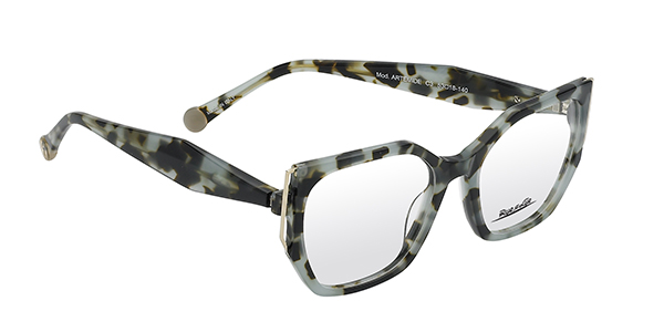 Artemide è una montatura della forma esagonale con i ciliari leggermente allungati e i musi evidenziati dal filo di metallo. Questo occhiale è reso ancora più sofisticato dagli acetati avana marmorizzati con trasparenze marroni, bianche e grigie e tocchi glitter.