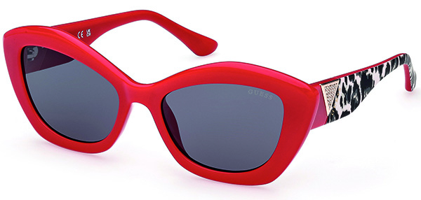 Le aste sono decorate con l’iconico logo triangolare GUESS illuminato da un prezioso pavé di cristalli scintillanti e, in alcune varianti, dall’esclusiva stampa leopardata. Il modello è disponibile in nero lucido e rosso.