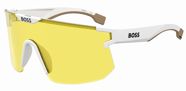 BOSS propone la mascherina lifestyle 1500S con montatura semi-rimless, lente gialla e logo su frontale e aste.