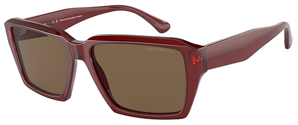 Non manca la proposta da sole femminile dalle linee geometriche accentuate: un occhiale realizzato in bio acetato trasparente con l’anima metallica delle aste a vista, contraddistinto dal logo Armani Sustainability Values stampato all’interno. Disponibile in marrone trasparente con lenti marrone chiaro, oppure grigio trasparente con lenti in tono.