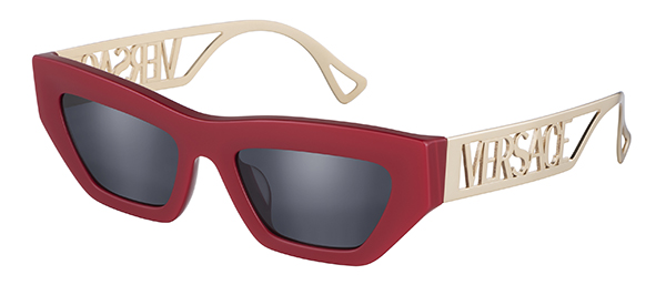 Un modello grafico contraddistinto da un frontale cat-eye oversize e una scritta in metallo sull’asta che riprende il logo anni ’90 di Versace. Proposto in versione rossa o nera, entrambe valorizzate dalle aste dorate.