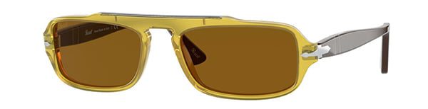 Persol 0PO3262S. Design rettangolare e montatura bold per questo occhiale da sole in acetato giallo, arricchito dall’inserimento di una decorazione in metallo che si collega alle aste con l’iconica cerniera flessibile in acciaio